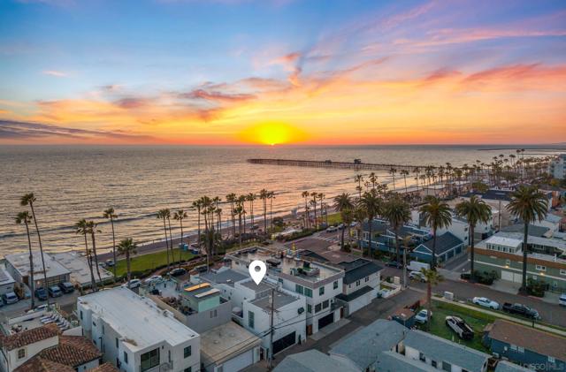 Commanding one of Southern California's most iconic stretches of sand, This stunning Mediterranean inspired beach front retreat delivers next level coastal living. Spanning 3300 SF with 4 bedrooms, 3 bathrooms and show stopping ocean views, 208 South Pacific puts you front and center in SoCal's coastal renaissance. Step inside & let the rhythm of the ocean set the tone. A Thoughtfully reversed floor plan places the kitchen and living space upstairs-right where those panoramic views belong. Floor to ceiling windows flood the home with sunlight while the expansive balcony is tailor made for golden hour cocktails and breezy alfresco dining. Dual primary suites-one on each level-offer flexibility for guests or multi gen living. Downstairs, wide open sliders open to a serene fountain patio that feels like your own private oasis. Style-wise it is a perfect fusion of timeless charm & elevated upgrades: travertine flooring, Grecian columns, granite countertops & custom cabinetry pair effortlessly with Milgard window, high end appliances & a full smart home security system. And the location? Absolute fire. Just 5 minutes on foot lands you in the heart of Oceanside's buzzing downtown-artisan coffee shops, destination dining, indie boutiques & the new Oceanside Beachfront Resort Hotel. With a major nine block revitalization in full swing this coastal enclave is quickly becoming one of SoCal's most exciting hot spots. What's more, the Pier View Way Bridge is getting a fresh facelift adding even more charm to your daily scene.